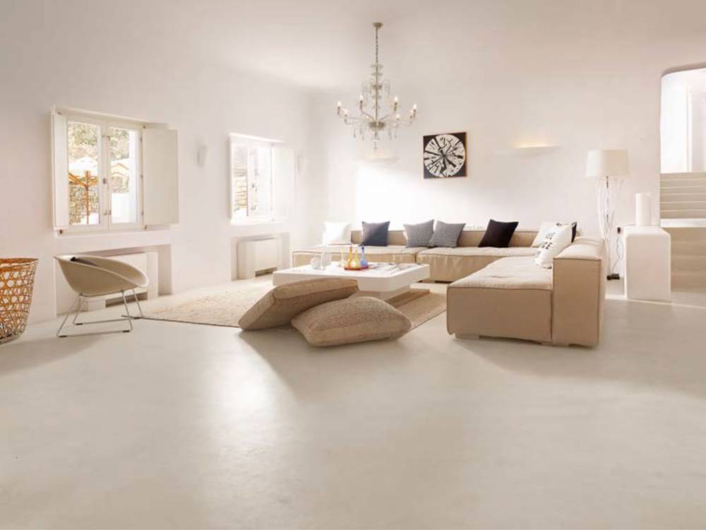 At Super Paradise Beach Club in Mykonos, microcement doesn’t decorate the space — it is the space. Curved walls, sculpted niches, sweeping stairs, and organic openings to the sky: every surface finished in the same unbroken white. A finish this ambitious has no tolerance for a topcoat that yellows, dulls, or shifts the color beneath it.