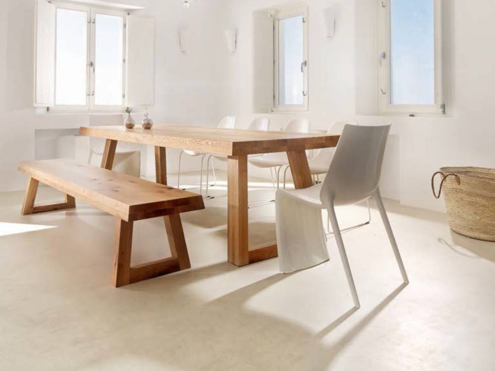2K Matte Varnish holds an installation like this together over time. Sealed under a catalyzed matte film, the microcement retains its pure, consistent tone across every curved plane — resistant to sun, salt air, and the demands of one of the Aegean’s most celebrated venues. Invisible in the finish. Indispensable to its longevity.